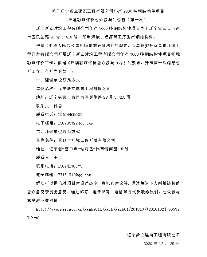 關于遼寧新立建筑工程有限公司年產7000噸鋼結構件項目環境影響評價公眾參與的公告(第一次)